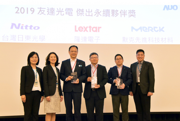 友達肯定供應商永續經營的優異表現,頒發傑出永續夥伴獎 (圖左到右:友達光電永續長古秀華、友達光電供應鏈總部資深協理吳宜芳、默克先進董事長謝志宏、隆達電子財務副總張博儀、臺灣日東光學董事長塩見太、友達光電董事長暨執行長彭雙浪)